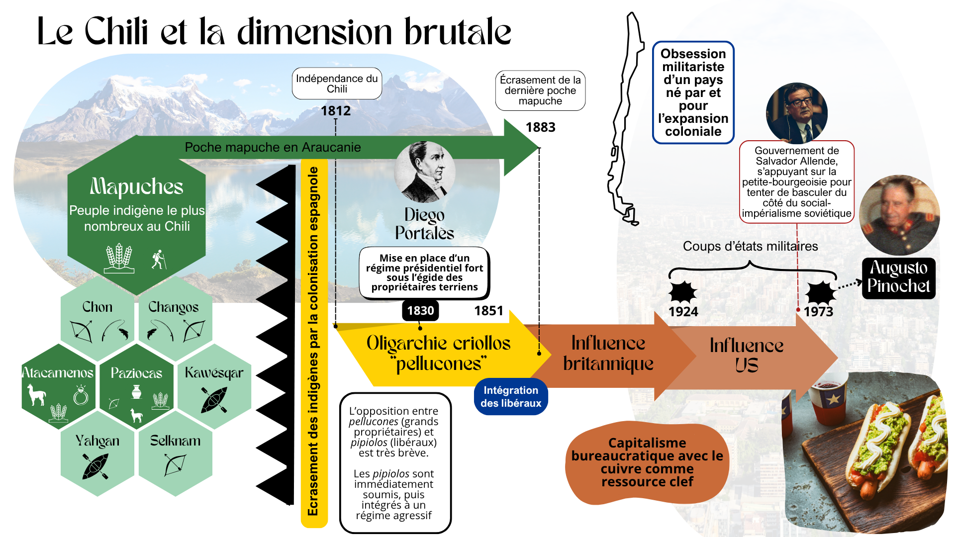 La naissance du Chili et son affirmation tiennent à cette colonisation aux dépens des Mapuches ; la dynamique que cela accorde à l’État chilien tient en une nature particulièrement agressive et expansionniste.